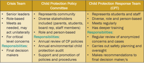 Most schools have a crisis team made up of senior leadership.  When schools take on policy writing, often a committee is created for this work.  New accreditation standards for child protection refer to child protection response teams.  See the table below for the overlapping and distinct requirements and responsibilities of these groups.
